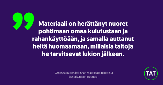 Syksyllä 2021 TAT tarjoaa nuorille uuden maksuttoman oman talouden hallinnan oppimateriaalipaketin. Santander on ollut laatimassa oppimateriaaleja yhdessä muiden alan toimijoiden kanssa. Uutta materiaalipakettia on pilotoitu keväällä 2021 ja materiaali tulee vapaaseen käyttöön elokuusta alkaen.